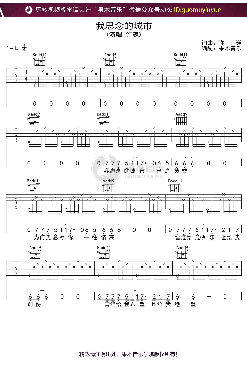 《许巍《我思念的城市吉他谱》(E调)》内容来自于互联网,不能保证内容的准确性与完整性,仅供学习交流欣赏,请勿用于其它用途,内容版权归原作者及来源网站所有,如有侵犯到您的权益请来信告知,我们将及时删除。