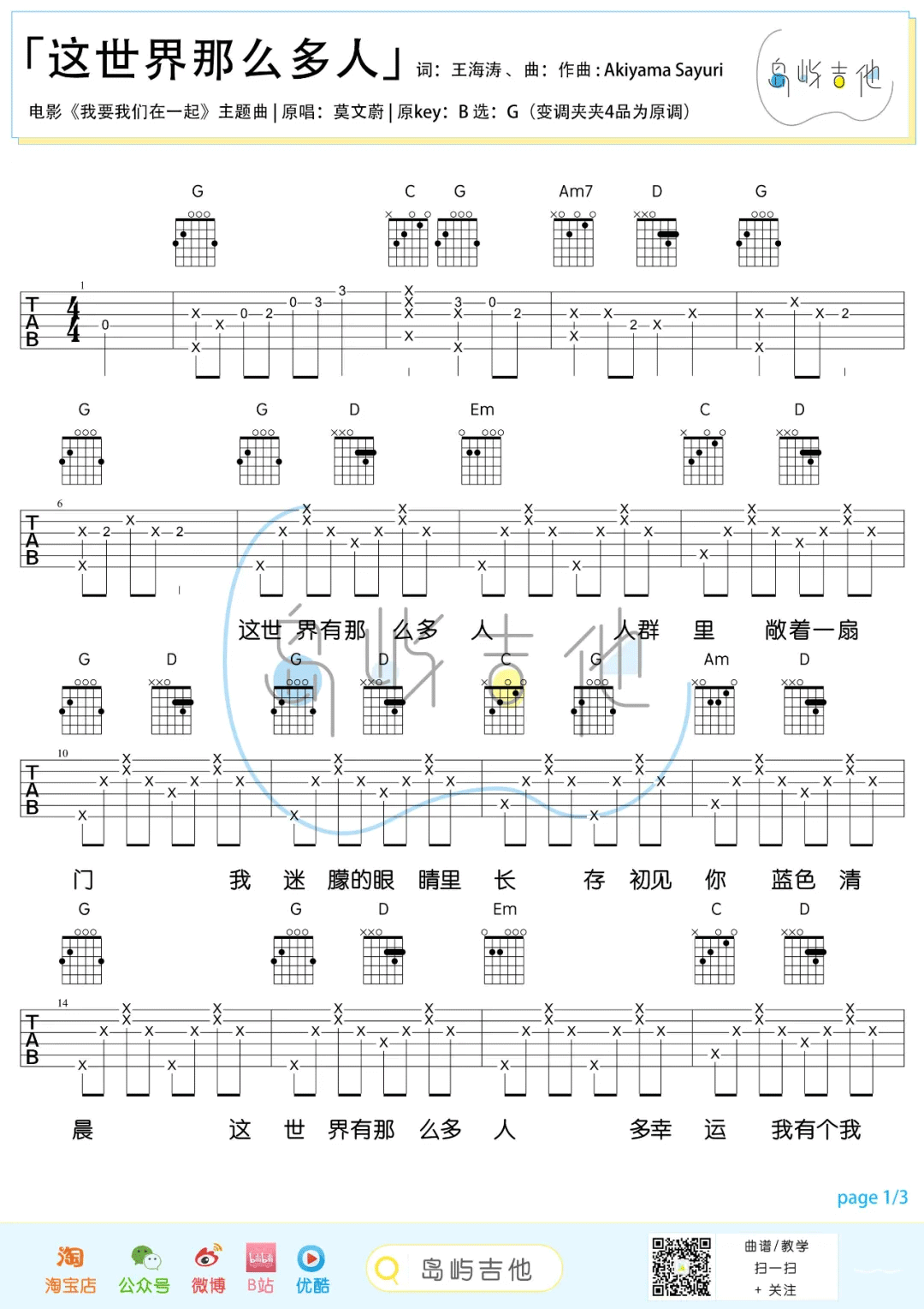 《莫文蔚《这世界那么多人吉他谱》(G调)》内容来自于互联网,不能保证内容的准确性与完整性,仅供学习交流欣赏,请勿用于其它用途,内容版权归原作者及来源网站所有,如有侵犯到您的权益请来信告知,我们将及时删除。