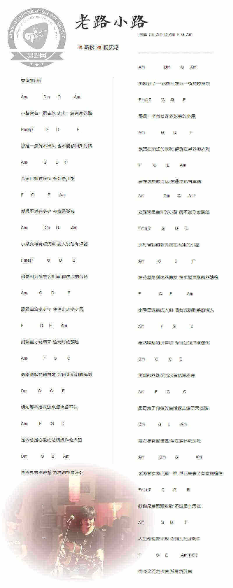《靳松为路平《靳松老路小路吉他谱》》内容来自于互联网,不能保证内容的准确性与完整性,仅供学习交流欣赏,请勿用于其它用途,内容版权归原作者及来源网站所有,如有侵犯到您的权益请来信告知,我们将及时删除。