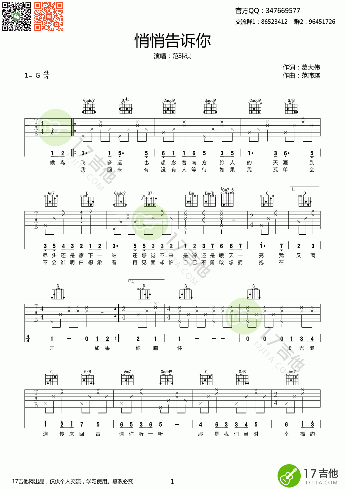《范玮琪《悄悄告诉你吉他谱》(G调)》内容来自于互联网,不能保证内容的准确性与完整性,仅供学习交流欣赏,请勿用于其它用途,内容版权归原作者及来源网站所有,如有侵犯到您的权益请来信告知,我们将及时删除。