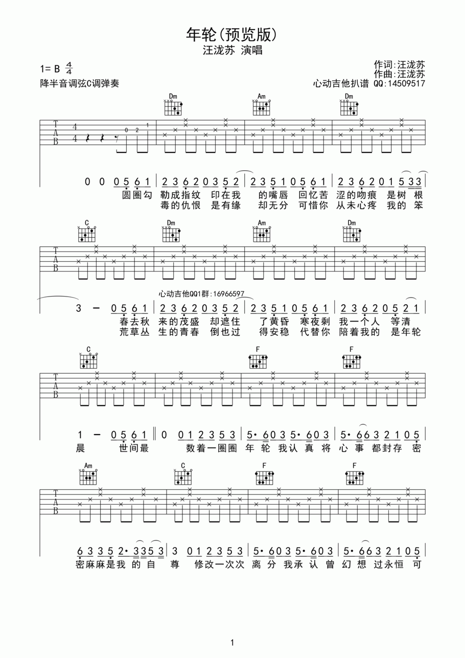 这首曲谱是汪苏泷演唱的《年轮》,原调为B调和C调,适合吉他演奏。它包含六行乐谱,以及吉他演唱所需的半音、指环等要素。这首曲谱是电视剧《传奇仙女剑客》中张碧琴的插曲,带着浓厚的情感,适合用吉他演奏来表达。