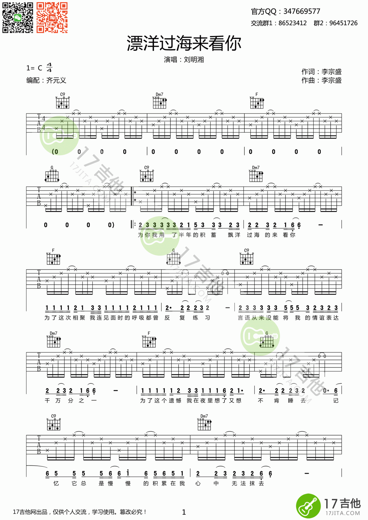 《刘明湘《漂洋过海来看你吉他谱》(C调)》内容来自于互联网,不能保证内容的准确性与完整性,仅供学习交流欣赏,请勿用于其它用途,内容版权归原作者及来源网站所有,如有侵犯到您的权益请来信告知,我们将及时删除。