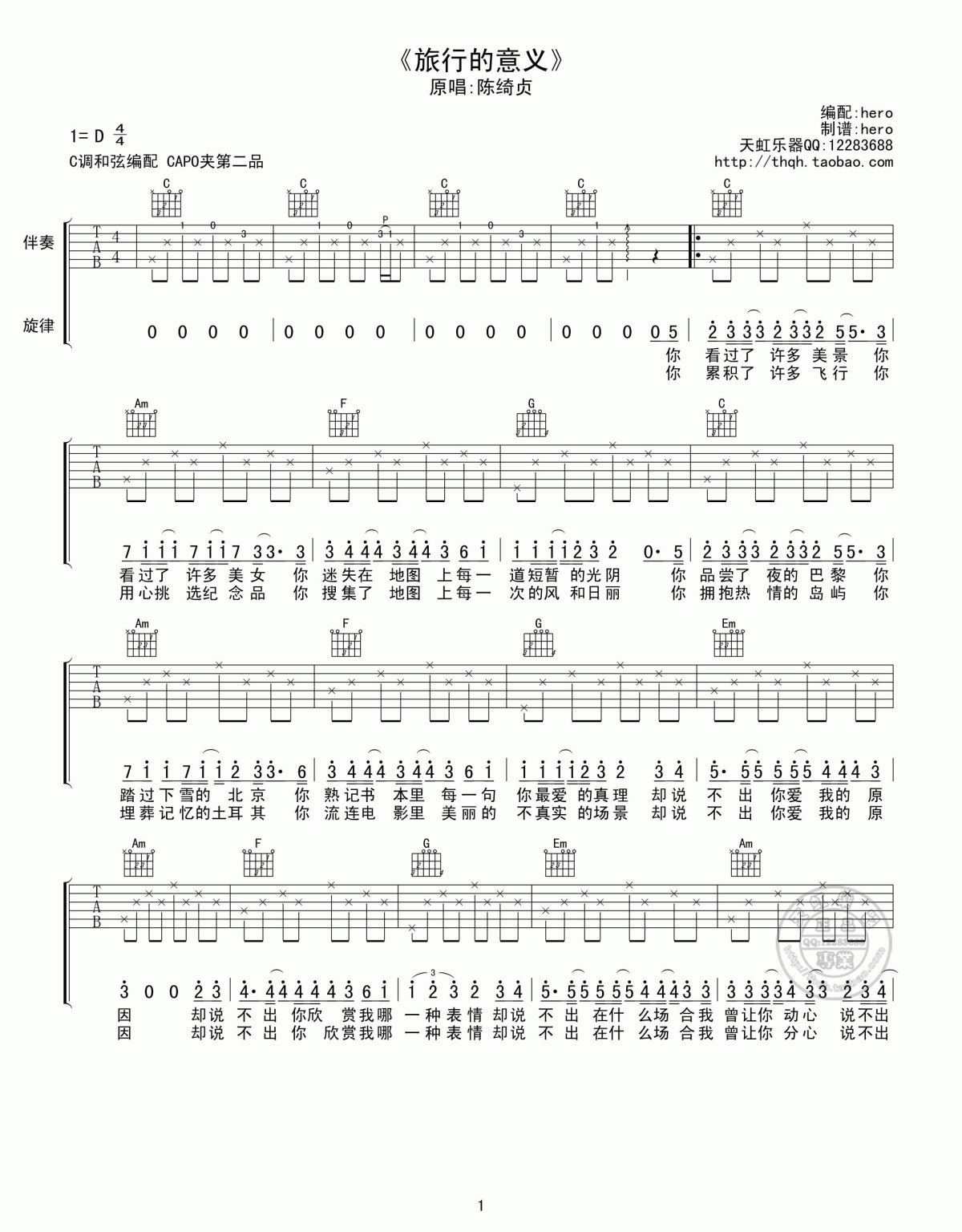 《陈绮贞《旅行的意义吉他谱》(C调)》内容来自于互联网,不能保证内容的准确性与完整性,仅供学习交流欣赏,请勿用于其它用途,内容版权归原作者及来源网站所有,如有侵犯到您的权益请来信告知,我们将及时删除。