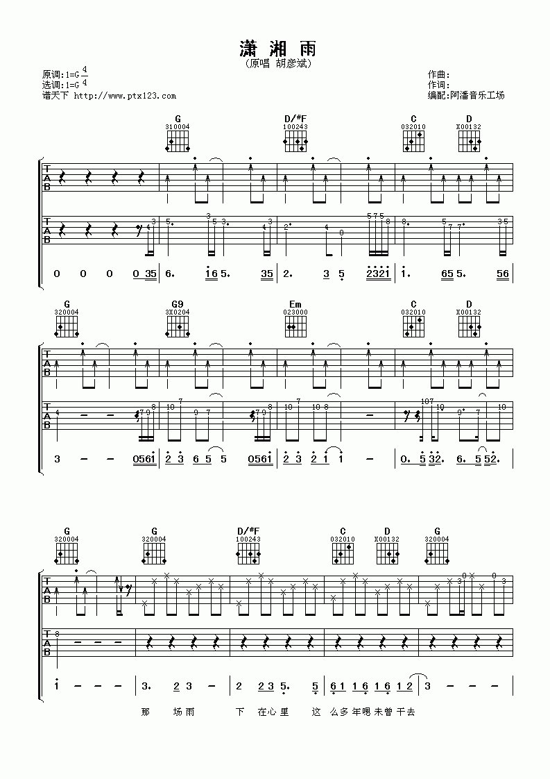 《胡彦斌《潇湘雨吉他谱》》内容来自于互联网,不能保证内容的准确性与完整性,仅供学习交流欣赏,请勿用于其它用途,内容版权归原作者及来源网站所有,如有侵犯到您的权益请来信告知,我们将及时删除。