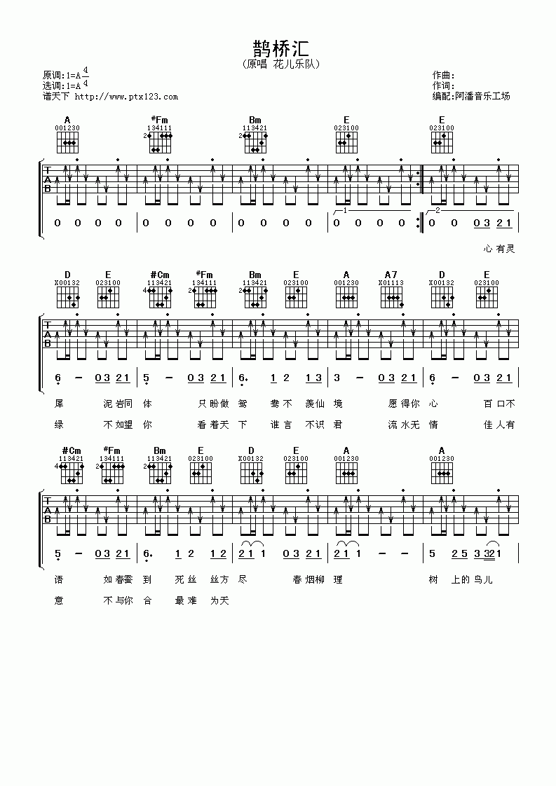 《花儿乐队《鹊桥汇吉他谱》》内容来自于互联网,不能保证内容的准确性与完整性,仅供学习交流欣赏,请勿用于其它用途,内容版权归原作者及来源网站所有,如有侵犯到您的权益请来信告知,我们将及时删除。