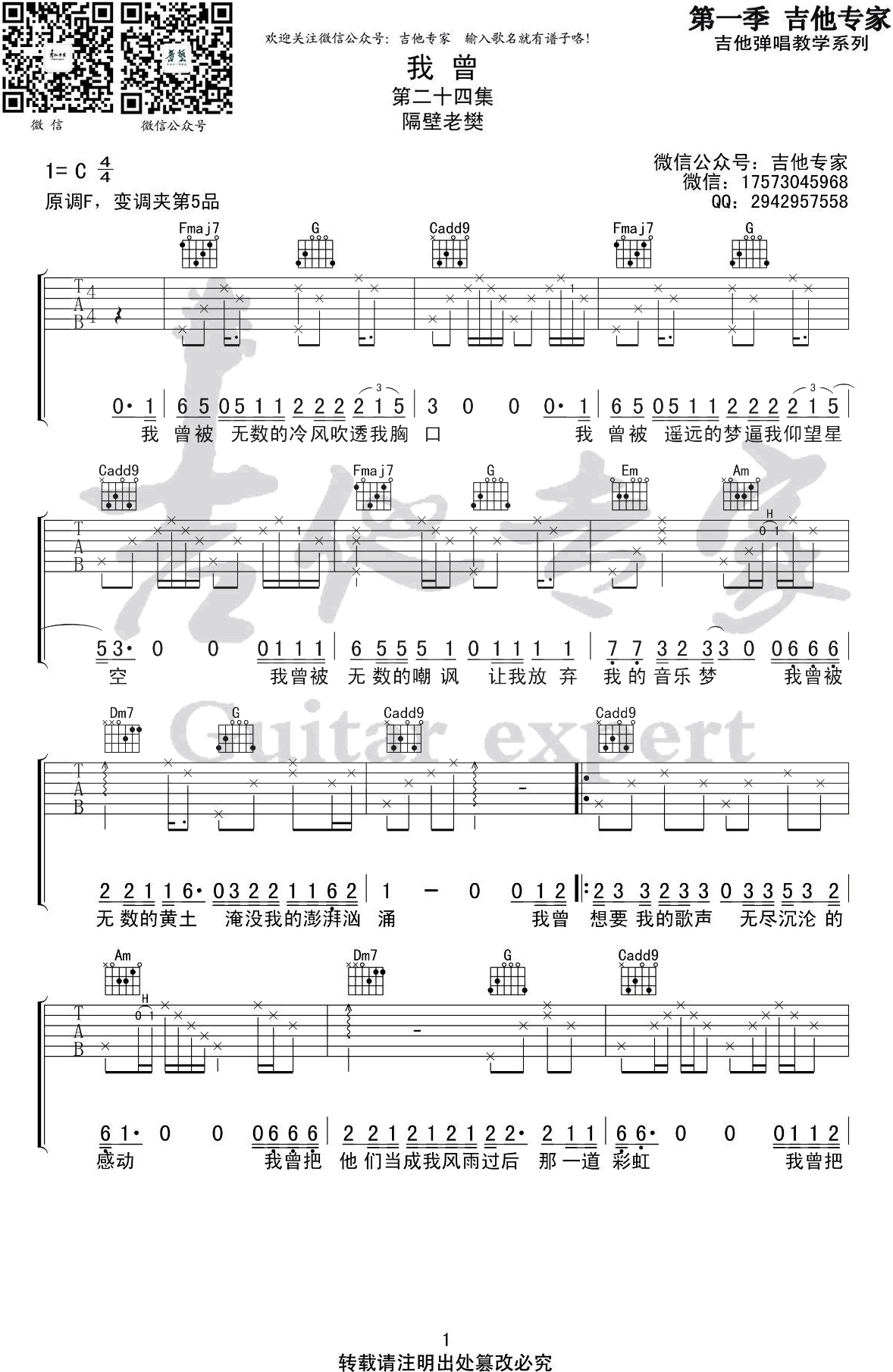 《隔壁老樊《我曾吉他谱》(C调)》内容来自于互联网,不能保证内容的准确性与完整性,仅供学习交流欣赏,请勿用于其它用途,内容版权归原作者及来源网站所有,如有侵犯到您的权益请来信告知,我们将及时删除。