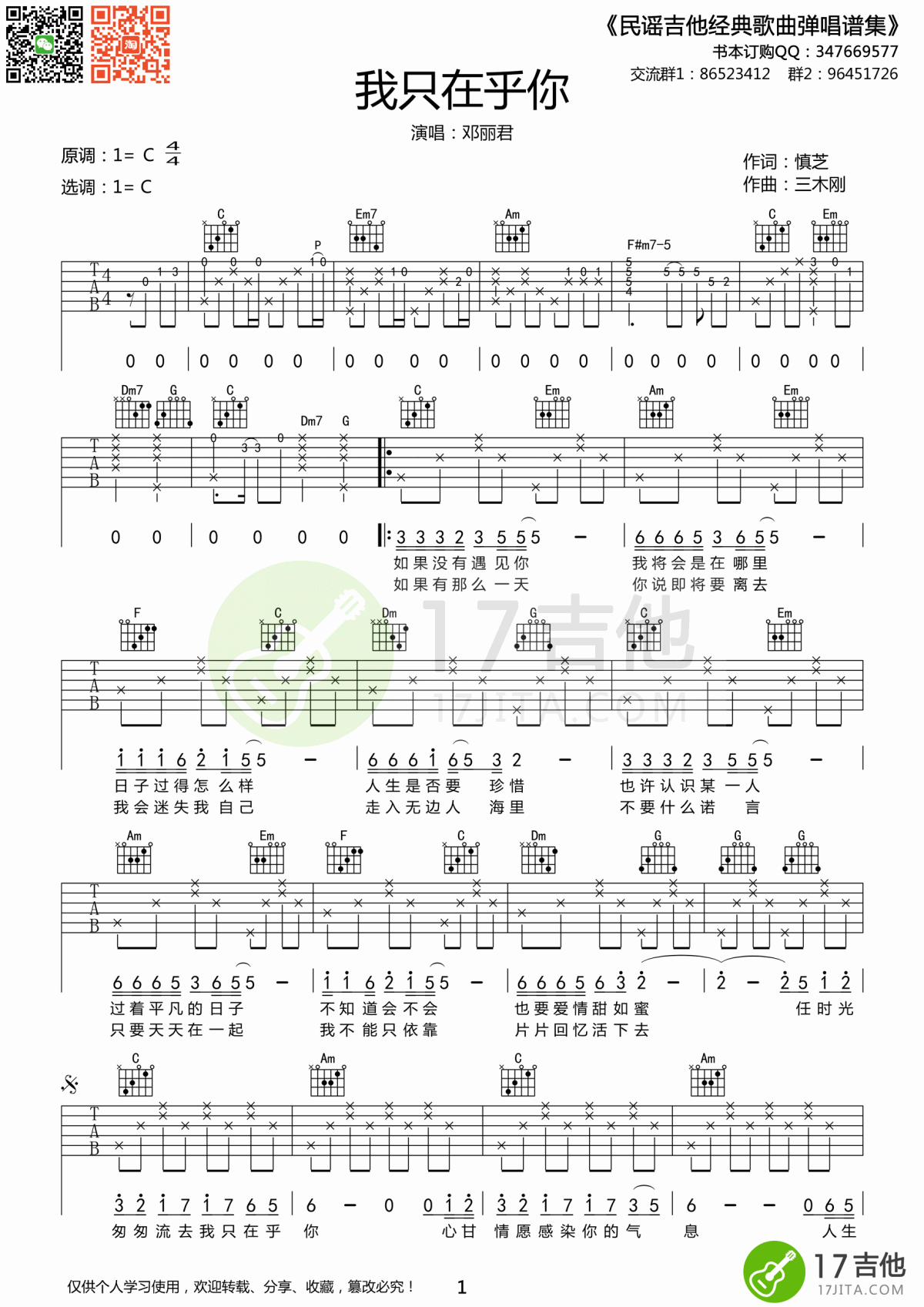 《邓丽君《我只在乎你吉他谱》》内容来自于互联网,不能保证内容的准确性与完整性,仅供学习交流欣赏,请勿用于其它用途,内容版权归原作者及来源网站所有,如有侵犯到您的权益请来信告知,我们将及时删除。
