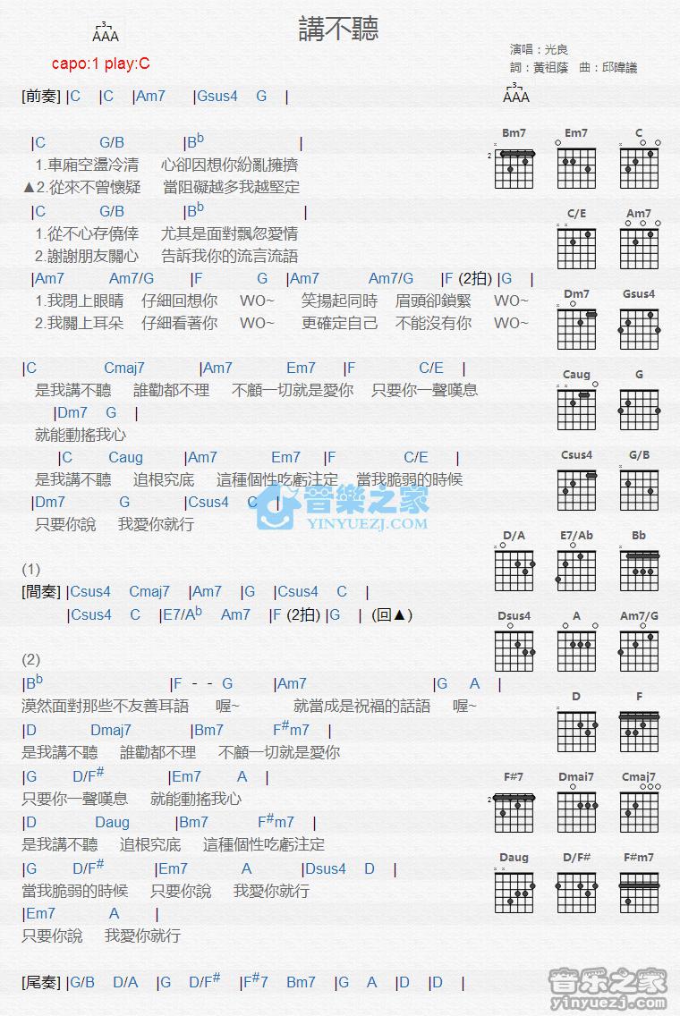 《光良《讲不听吉他谱》(C调)》内容来自于互联网,不能保证内容的准确性与完整性,仅供学习交流欣赏,请勿用于其它用途,内容版权归原作者及来源网站所有,如有侵犯到您的权益请来信告知,我们将及时删除。