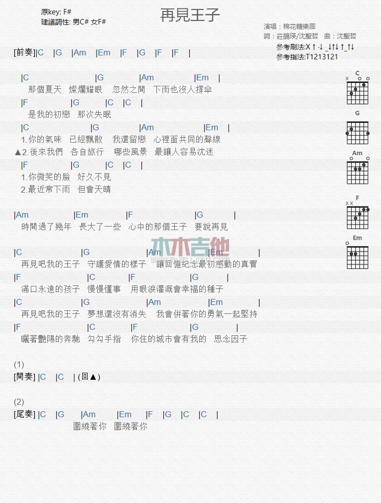 《台湾乐队棉花糖《再见王子吉他谱》》内容来自于互联网,不能保证内容的准确性与完整性,仅供学习交流欣赏,请勿用于其它用途,内容版权归原作者及来源网站所有,如有侵犯到您的权益请来信告知,我们将及时删除。