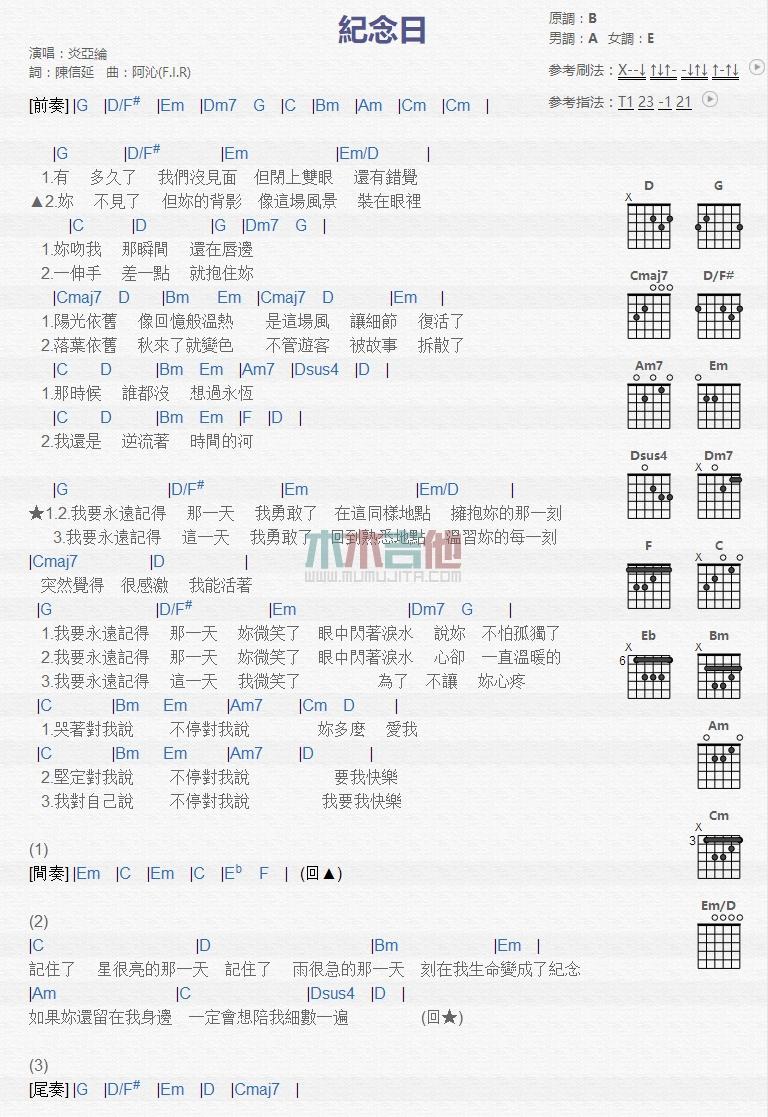 这首吉他曲以原调B为基调,适合男生以A调演奏,女生则以E调演奏。歌曲来自炎亚纶,是一首充满温暖风情的名曲。歌手在旋律中巧妙地融入秋天的色彩,勾勒出初恋的美好回忆。歌词中流淌着温暖的感情,勾勒着过往点滴的美好瞬间。纪念日成为歌曲中的关键词,将两颗心的感觉封存在某