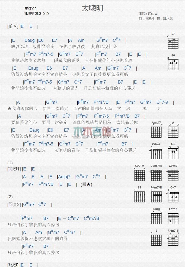 《陈绮贞《太聪明吉他谱》》内容来自于互联网,不能保证内容的准确性与完整性,仅供学习交流欣赏,请勿用于其它用途,内容版权归原作者及来源网站所有,如有侵犯到您的权益请来信告知,我们将及时删除。