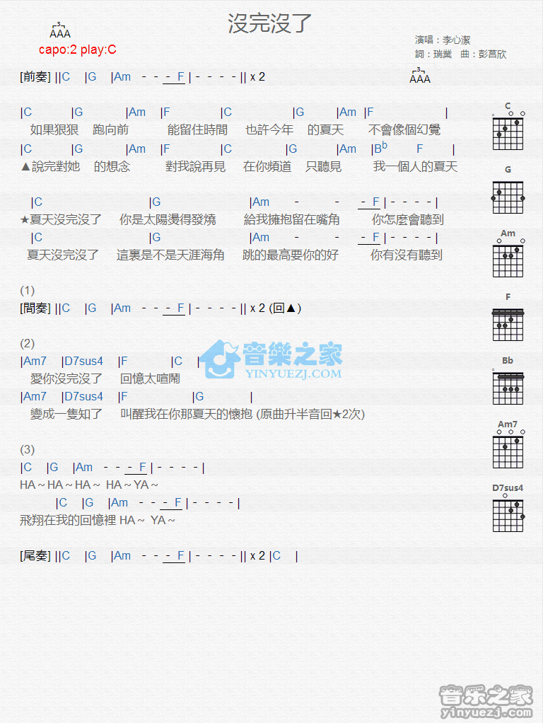 《宁静《没完没了吉他谱》(C调)》内容来自于互联网,不能保证内容的准确性与完整性,仅供学习交流欣赏,请勿用于其它用途,内容版权归原作者及来源网站所有,如有侵犯到您的权益请来信告知,我们将及时删除。
