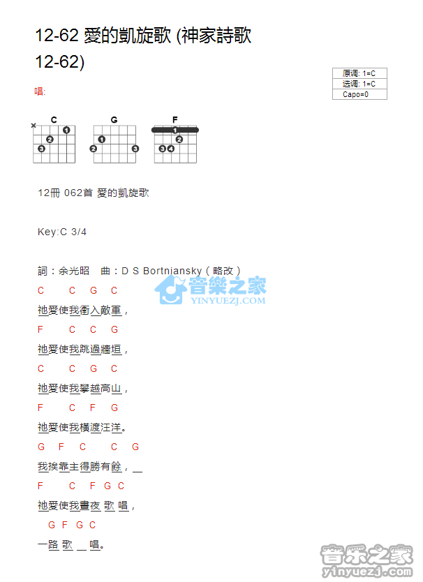 这首歌曲《爱的凯旋歌》吉他谱以C调为基调,是神家诗歌的精选之一。作者表达了在上帝的引领下,他感受到了胜利的喜悦,深刻而动人。歌谱中流畅的旋律如同一曲凯旋之歌,唤起心中的喜悦。在主的爱的滋润下,歌者感受到昼夜的欢歌,将这份喜悦传颂而出。这谱子旋律悠扬,充满了对生