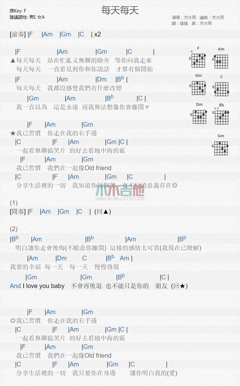 《方大同《每天每天吉他谱》》内容来自于互联网,不能保证内容的准确性与完整性,仅供学习交流欣赏,请勿用于其它用途,内容版权归原作者及来源网站所有,如有侵犯到您的权益请来信告知,我们将及时删除。