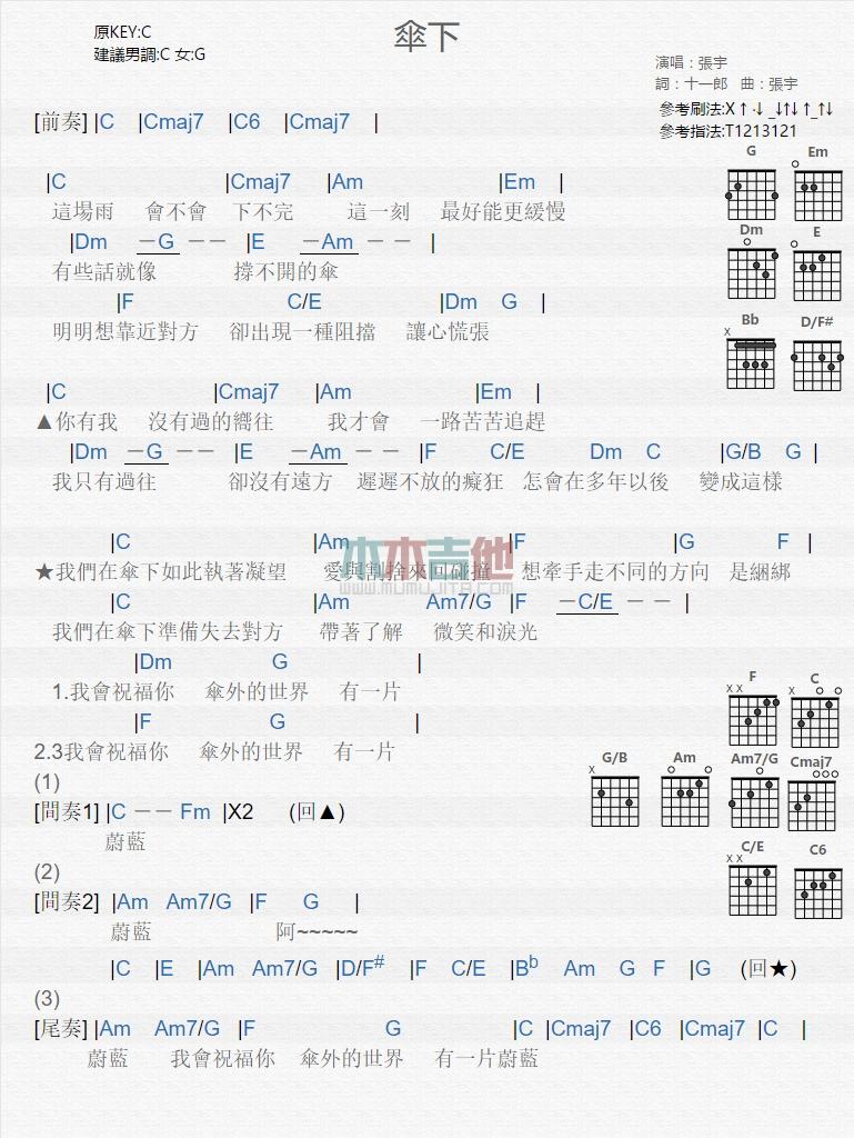 《张宇《伞下吉他谱》》内容来自于互联网,不能保证内容的准确性与完整性,仅供学习交流欣赏,请勿用于其它用途,内容版权归原作者及来源网站所有,如有侵犯到您的权益请来信告知,我们将及时删除。