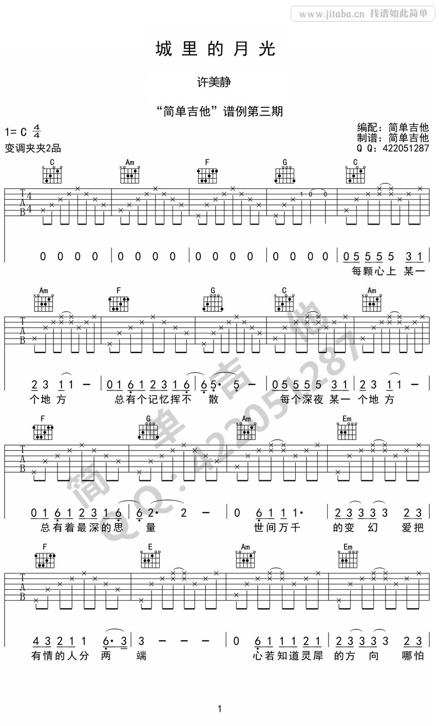 《许美静《城里的月光吉他谱》(C调)》内容来自于互联网,不能保证内容的准确性与完整性,仅供学习交流欣赏,请勿用于其它用途,内容版权归原作者及来源网站所有,如有侵犯到您的权益请来信告知,我们将及时删除。