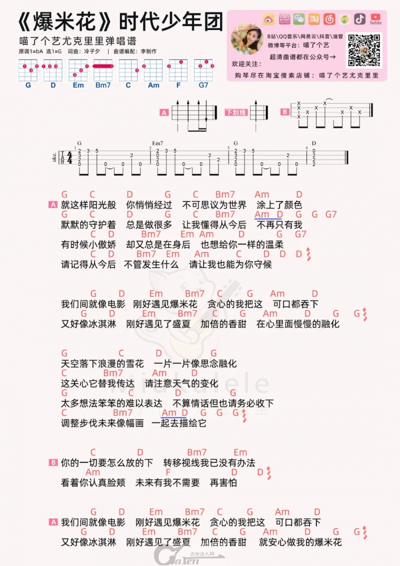 《时代少年团《爆米花吉他谱》(G调)》内容来自于互联网,不能保证内容的准确性与完整性,仅供学习交流欣赏,请勿用于其它用途,内容版权归原作者及来源网站所有,如有侵犯到您的权益请来信告知,我们将及时删除。