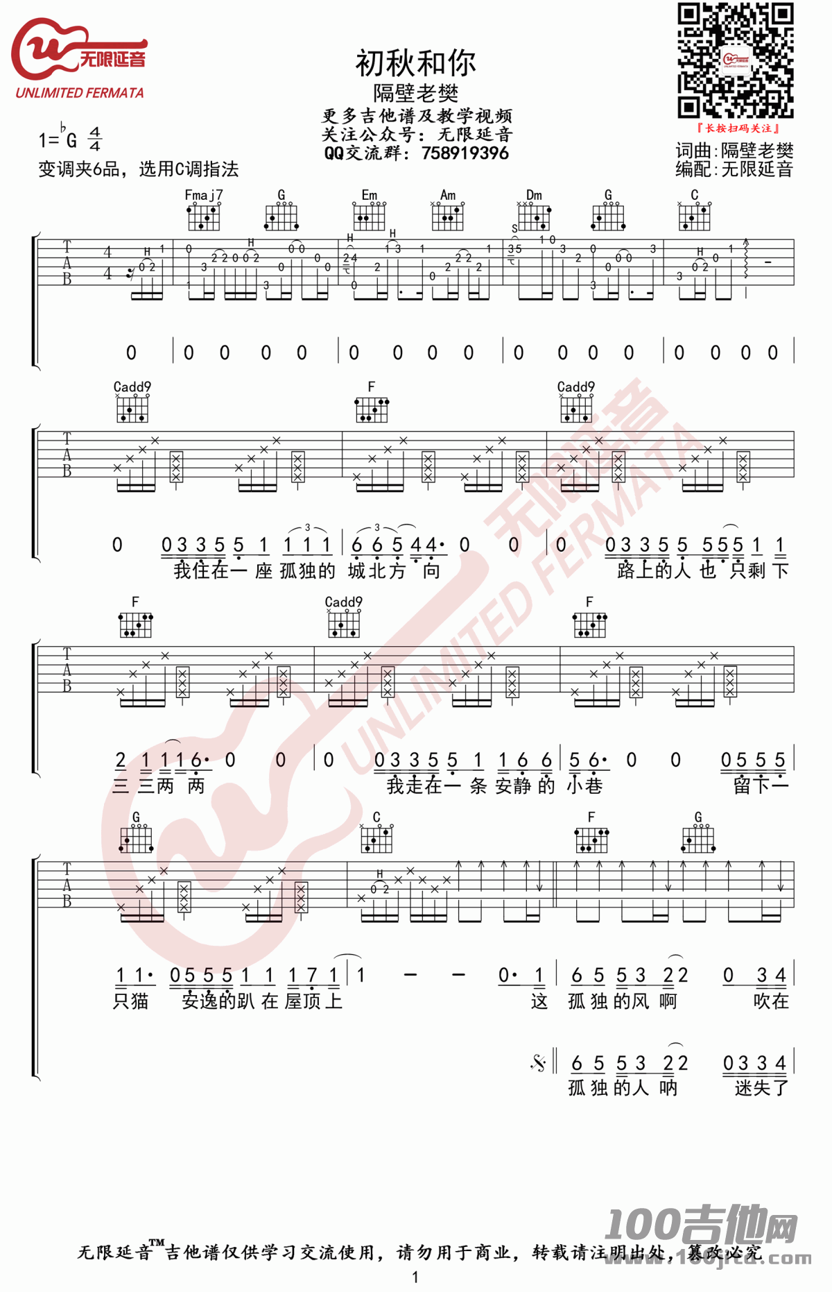 《隔壁老樊《初秋和你吉他谱》(C调)》内容来自于互联网,不能保证内容的准确性与完整性,仅供学习交流欣赏,请勿用于其它用途,内容版权归原作者及来源网站所有,如有侵犯到您的权益请来信告知,我们将及时删除。