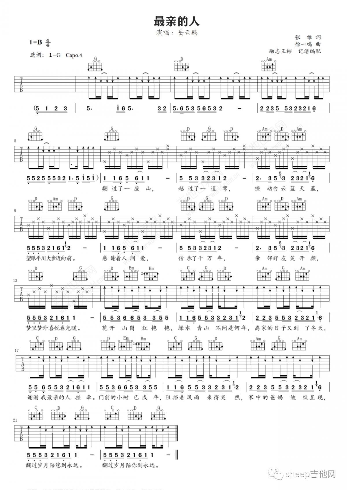 《岳云鹏《最亲的人吉他谱》(G调)》内容来自于互联网,不能保证内容的准确性与完整性,仅供学习交流欣赏,请勿用于其它用途,内容版权归原作者及来源网站所有,如有侵犯到您的权益请来信告知,我们将及时删除。