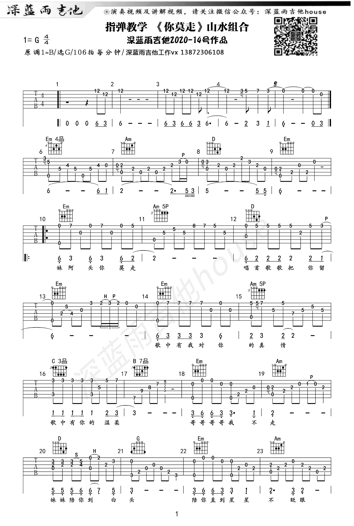 《山水组合《你莫走指弹谱吉他谱》》内容来自于互联网,不能保证内容的准确性与完整性,仅供学习交流欣赏,请勿用于其它用途,内容版权归原作者及来源网站所有,如有侵犯到您的权益请来信告知,我们将及时删除。