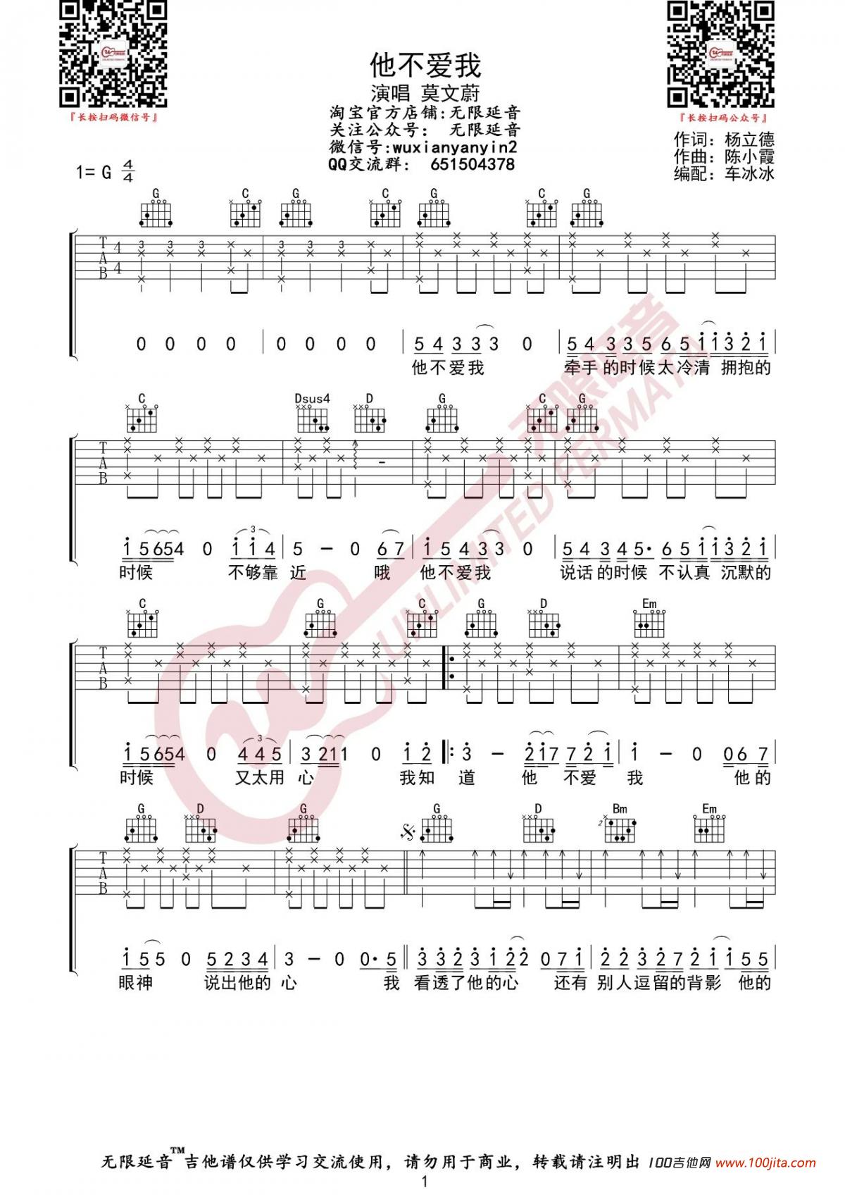 《莫文蔚《他不爱我吉他谱》(G调)》内容来自于互联网,不能保证内容的准确性与完整性,仅供学习交流欣赏,请勿用于其它用途,内容版权归原作者及来源网站所有,如有侵犯到您的权益请来信告知,我们将及时删除。