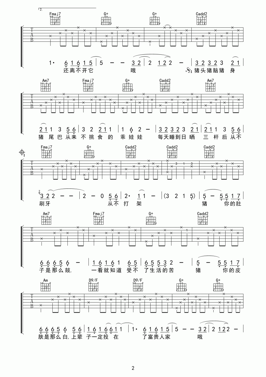 《《猪之歌吉他谱》》内容来自于互联网,不能保证内容的准确性与完整性,仅供学习交流欣赏,请勿用于其它用途,内容版权归原作者及来源网站所有,如有侵犯到您的权益请来信告知,我们将及时删除。