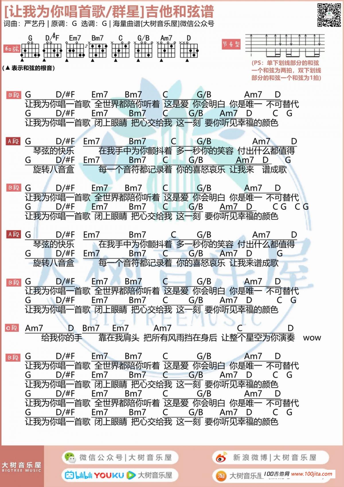 《魏晨《让我为你唱首歌吉他谱》》内容来自于互联网,不能保证内容的准确性与完整性,仅供学习交流欣赏,请勿用于其它用途,内容版权归原作者及来源网站所有,如有侵犯到您的权益请来信告知,我们将及时删除。