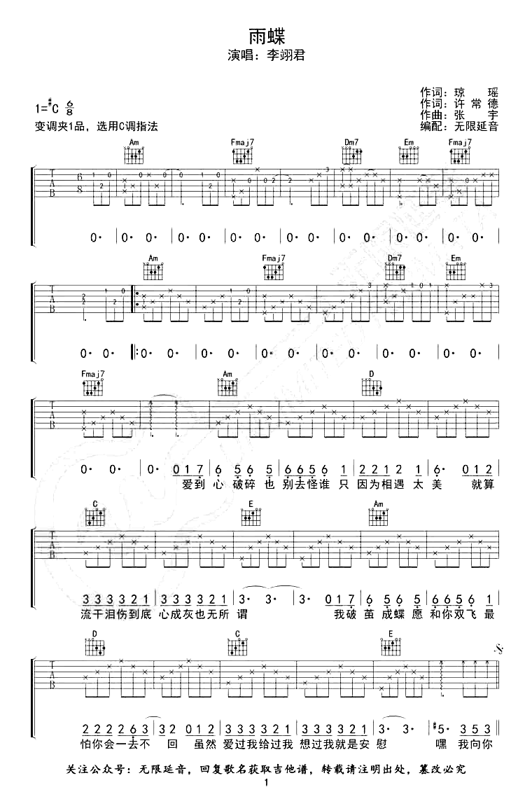 《格格《雨蝶吉他谱》(C调)》内容来自于互联网,不能保证内容的准确性与完整性,仅供学习交流欣赏,请勿用于其它用途,内容版权归原作者及来源网站所有,如有侵犯到您的权益请来信告知,我们将及时删除。