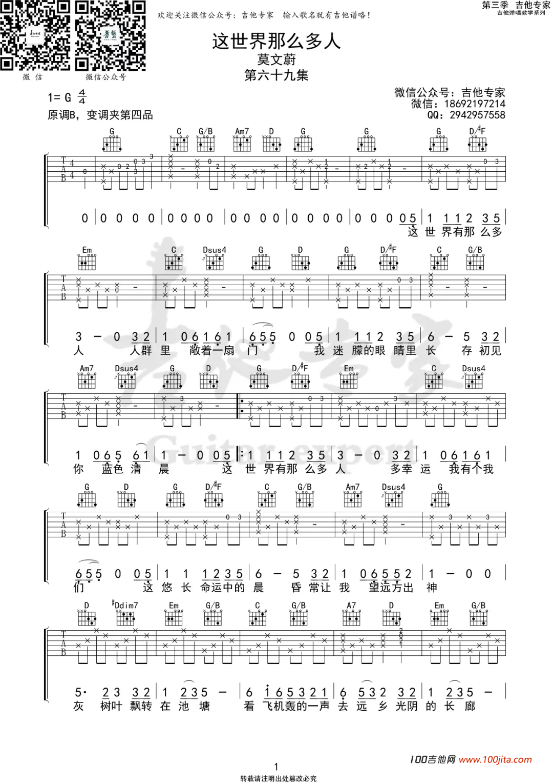 《莫文蔚《这世界那么多人吉他谱》(G调)》内容来自于互联网,不能保证内容的准确性与完整性,仅供学习交流欣赏,请勿用于其它用途,内容版权归原作者及来源网站所有,如有侵犯到您的权益请来信告知,我们将及时删除。