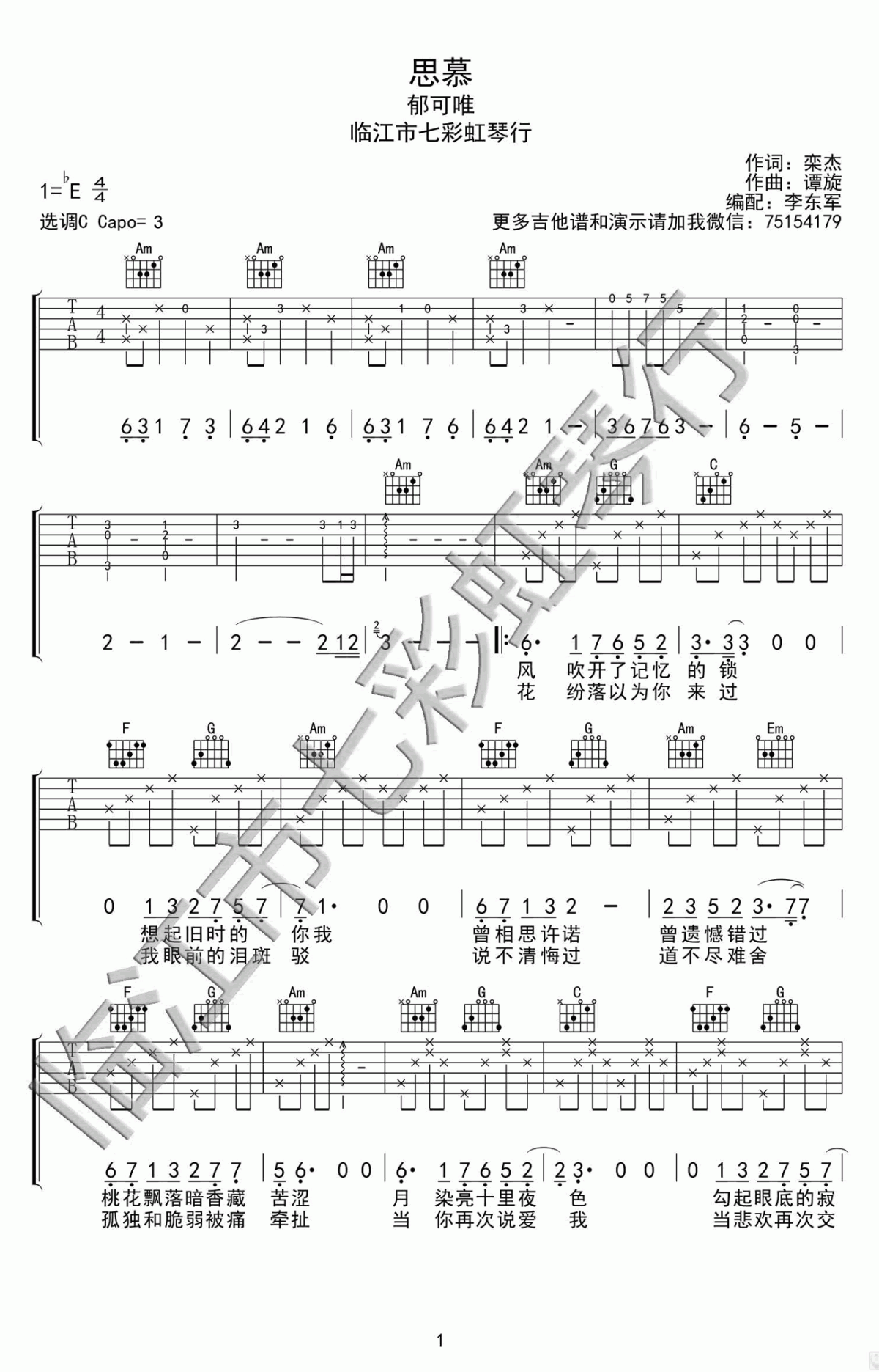 《郁可唯《思慕吉他谱》(C调)》内容来自于互联网,不能保证内容的准确性与完整性,仅供学习交流欣赏,请勿用于其它用途,内容版权归原作者及来源网站所有,如有侵犯到您的权益请来信告知,我们将及时删除。