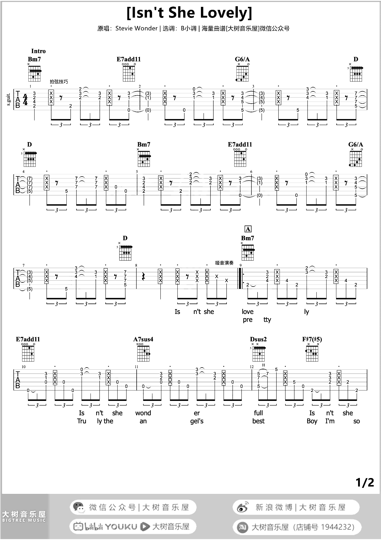 《Isnt She Lovely》是美国黑人歌手Stevie Wonder为庆祝他新生女儿而演唱的歌曲,从婴儿的哭声开始,记录了她成长的片段,以温馨和感动的方式表达了父爱之情。这首歌以B小调演奏,由大树音乐屋制谱。谱例包括两张高清图片,附带了吉他演示和教学视频