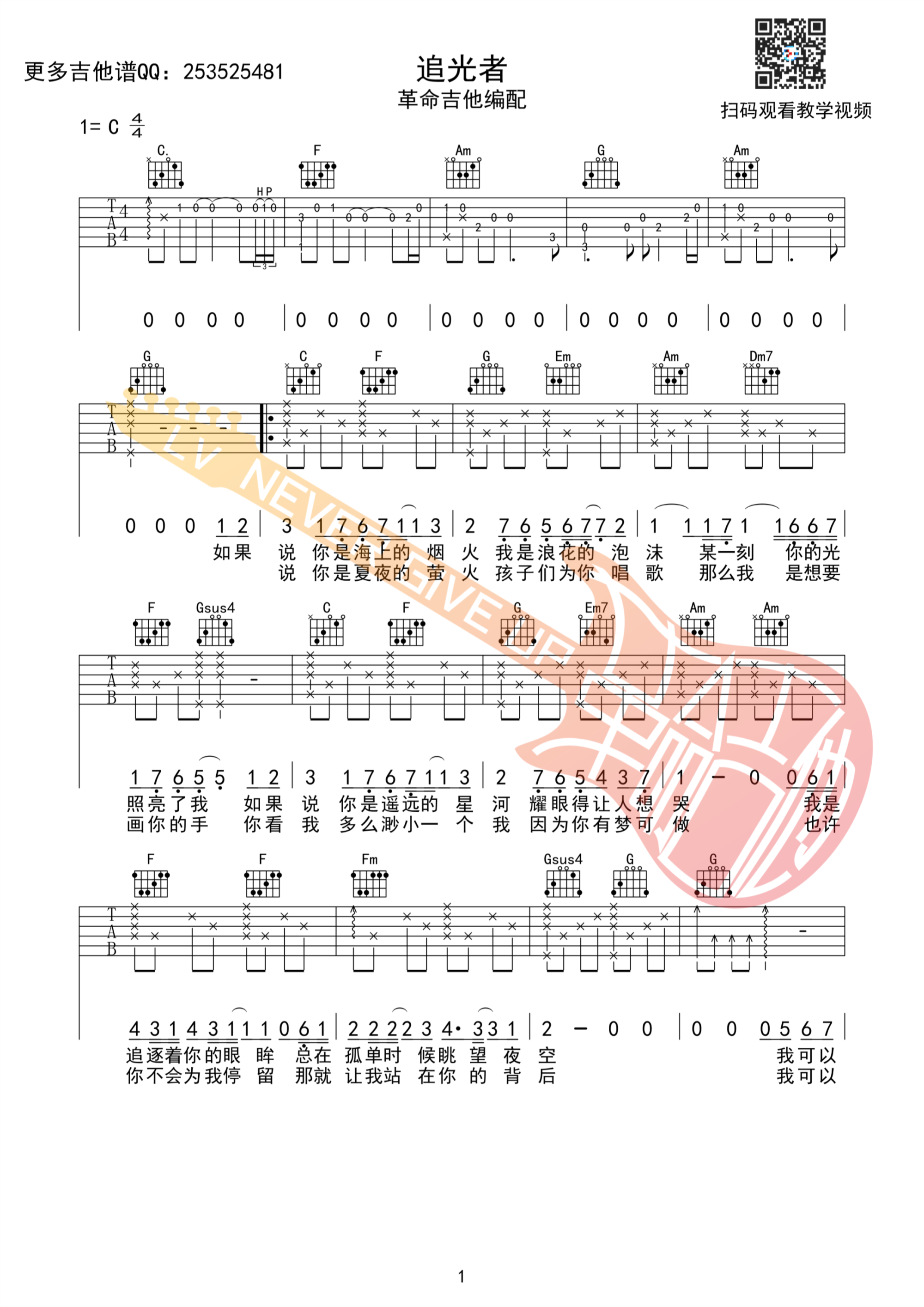 《岑宁儿《追光者吉他谱》(C调)》内容来自于互联网,不能保证内容的准确性与完整性,仅供学习交流欣赏,请勿用于其它用途,内容版权归原作者及来源网站所有,如有侵犯到您的权益请来信告知,我们将及时删除。