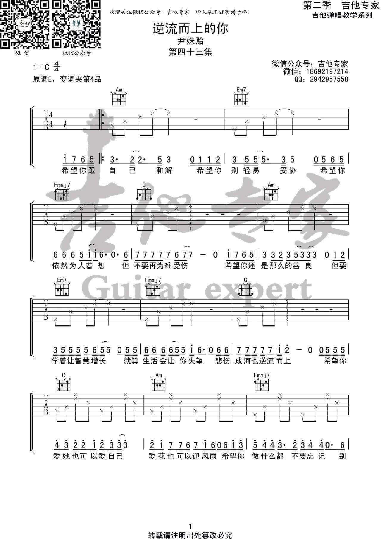 《《逆流而上的你吉他谱》(C调)》内容来自于互联网,不能保证内容的准确性与完整性,仅供学习交流欣赏,请勿用于其它用途,内容版权归原作者及来源网站所有,如有侵犯到您的权益请来信告知,我们将及时删除。