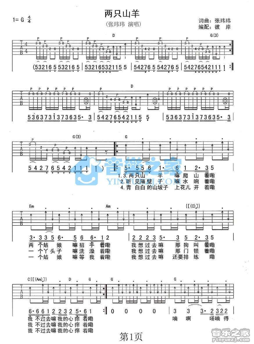 《张玮玮《两只山羊吉他谱》(G调)》内容来自于互联网,不能保证内容的准确性与完整性,仅供学习交流欣赏,请勿用于其它用途,内容版权归原作者及来源网站所有,如有侵犯到您的权益请来信告知,我们将及时删除。