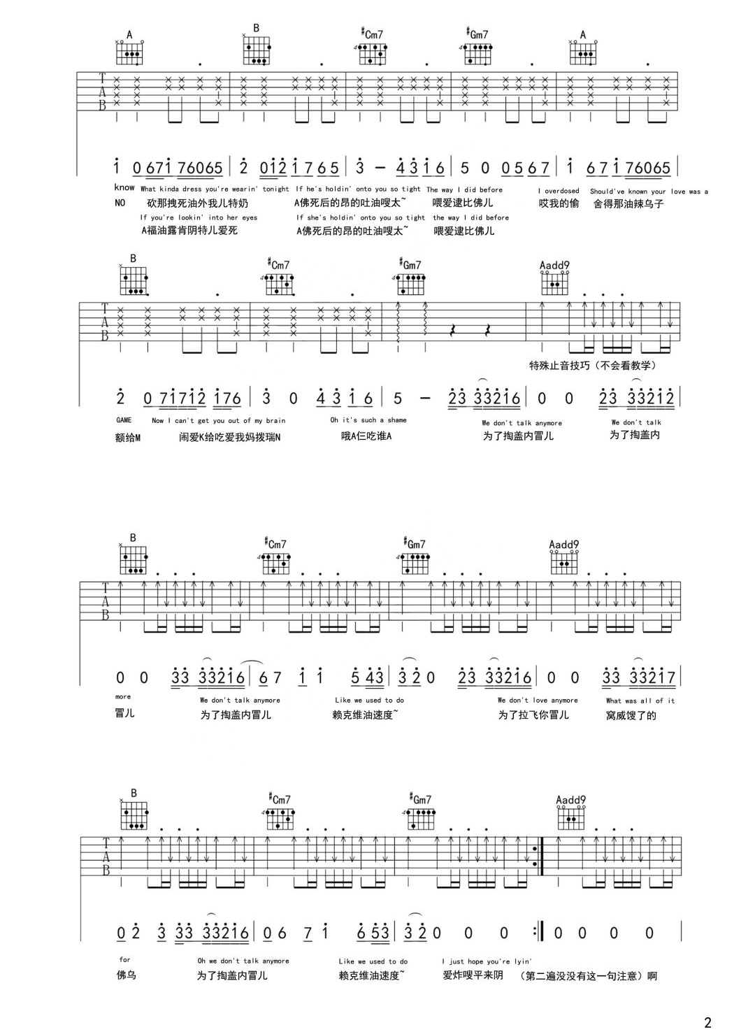 《Charlie Puth《We Don't Talk Anymore吉他谱》(E调)》内容来自于互联网,不能保证内容的准确性与完整性,仅供学习交流欣赏,请勿用于其它用途,内容版权归原作者及来源网站所有,如有侵犯到您的权益请来信告知,我们将及时删除。