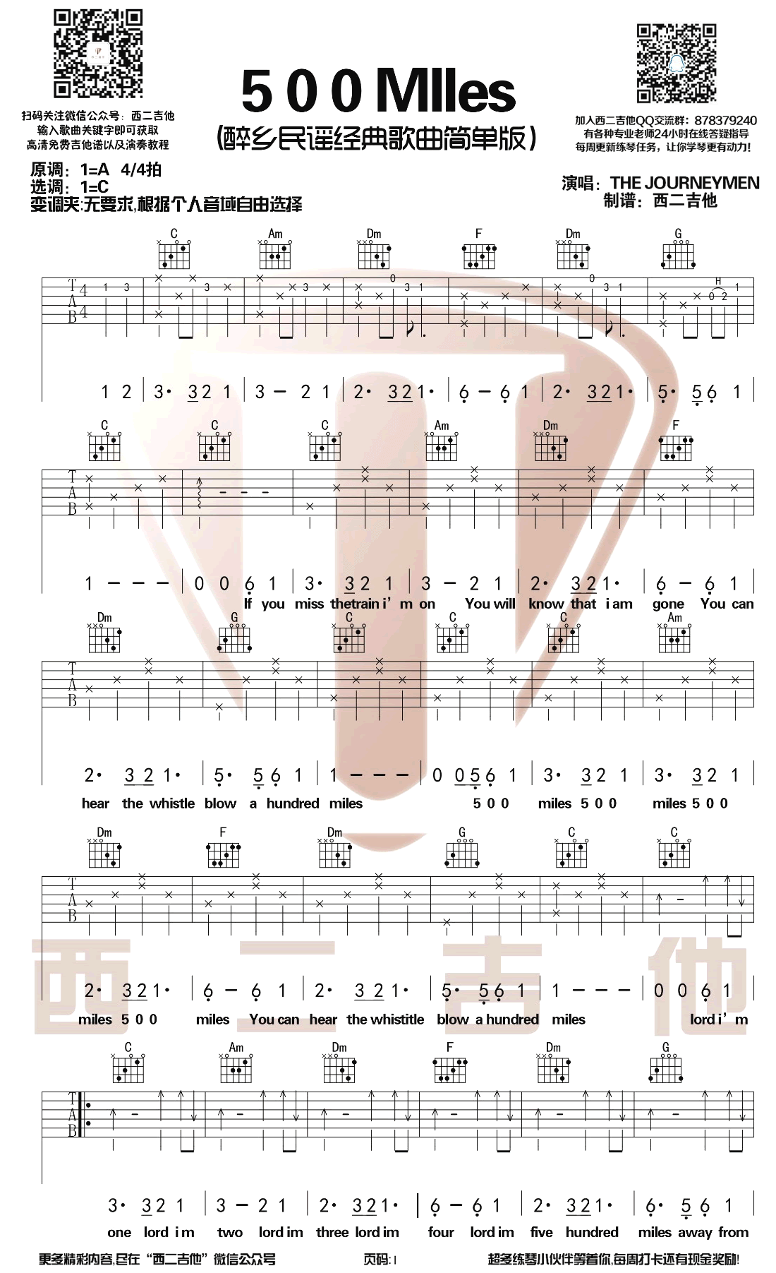 《西二《500miles吉他谱》(C调)》内容来自于互联网,不能保证内容的准确性与完整性,仅供学习交流欣赏,请勿用于其它用途,内容版权归原作者及来源网站所有,如有侵犯到您的权益请来信告知,我们将及时删除。