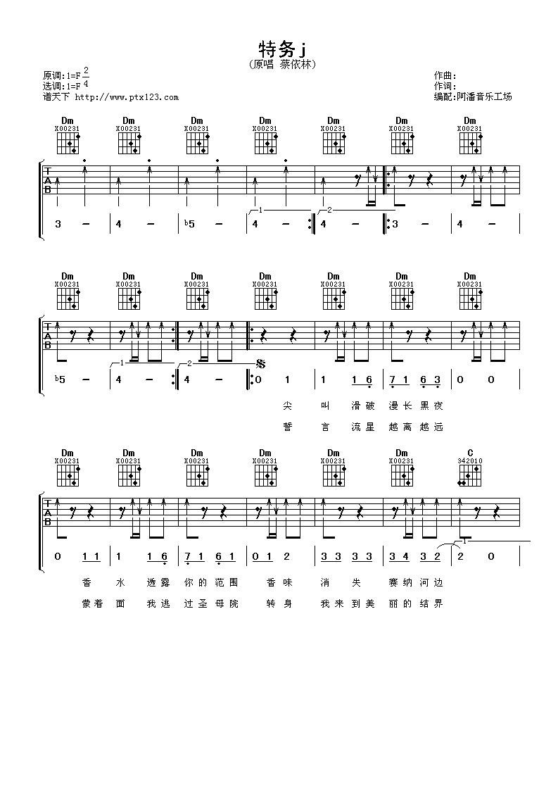 《蔡依林《特务j吉他谱》(F调)》内容来自于互联网,不能保证内容的准确性与完整性,仅供学习交流欣赏,请勿用于其它用途,内容版权归原作者及来源网站所有,如有侵犯到您的权益请来信告知,我们将及时删除。