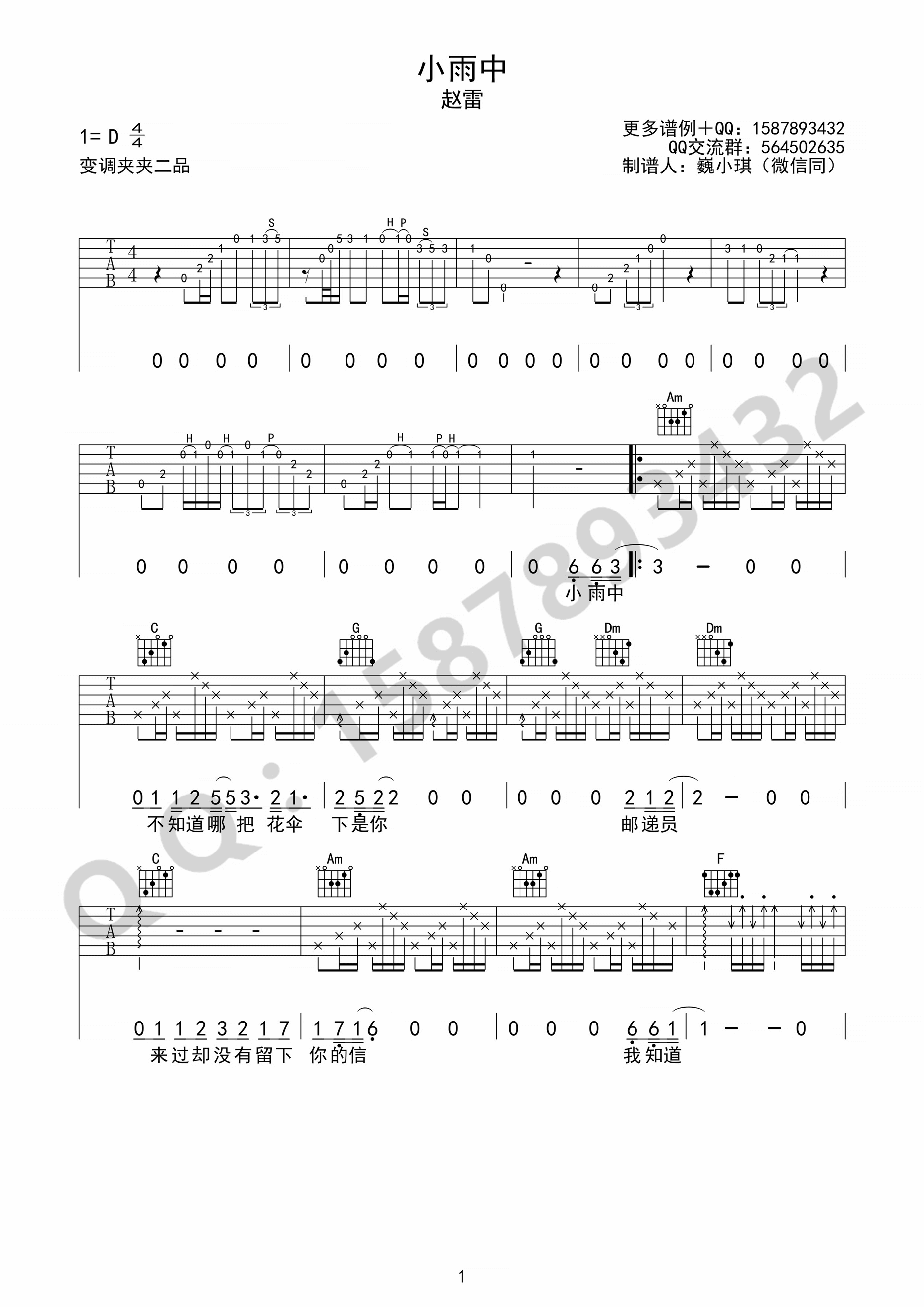 《小琪《小雨中吉他谱》(D调)》内容来自于互联网,不能保证内容的准确性与完整性,仅供学习交流欣赏,请勿用于其它用途,内容版权归原作者及来源网站所有,如有侵犯到您的权益请来信告知,我们将及时删除。
