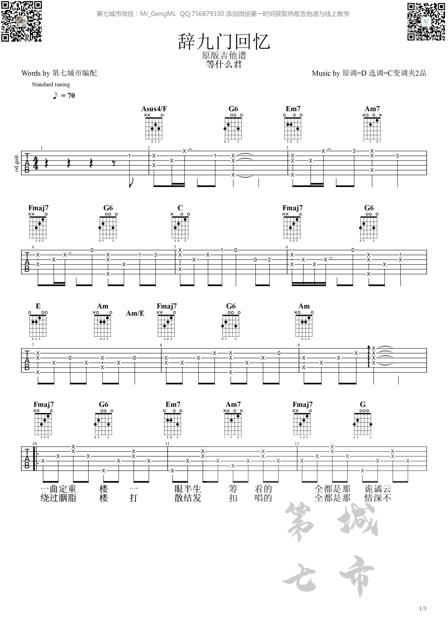 《《辞九门回忆吉他谱》(C调)》内容来自于互联网,不能保证内容的准确性与完整性,仅供学习交流欣赏,请勿用于其它用途,内容版权归原作者及来源网站所有,如有侵犯到您的权益请来信告知,我们将及时删除。