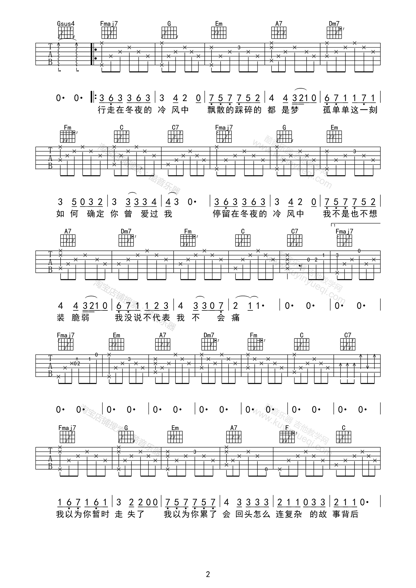 《刘思涵《走在冷风中吉他谱》(C调)》内容来自于互联网,不能保证内容的准确性与完整性,仅供学习交流欣赏,请勿用于其它用途,内容版权归原作者及来源网站所有,如有侵犯到您的权益请来信告知,我们将及时删除。
