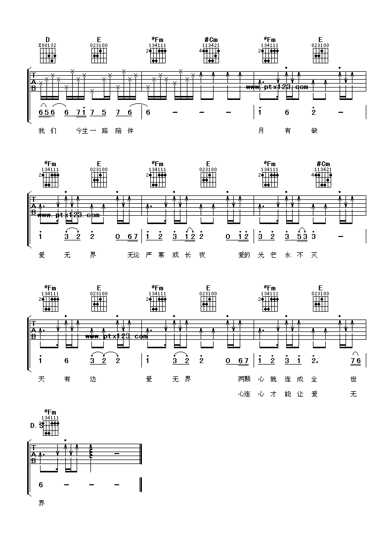 《《爱无界吉他谱》(A调)》内容来自于互联网,不能保证内容的准确性与完整性,仅供学习交流欣赏,请勿用于其它用途,内容版权归原作者及来源网站所有,如有侵犯到您的权益请来信告知,我们将及时删除。
