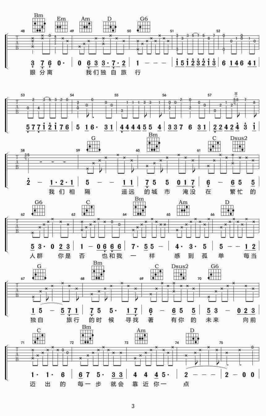 《《独自旅行吉他谱》(G调)》内容来自于互联网,不能保证内容的准确性与完整性,仅供学习交流欣赏,请勿用于其它用途,内容版权归原作者及来源网站所有,如有侵犯到您的权益请来信告知,我们将及时删除。