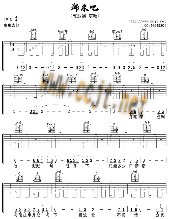 《陈慧娴《归来吧吉他谱》(C调)》内容来自于互联网,不能保证内容的准确性与完整性,仅供学习交流欣赏,请勿用于其它用途,内容版权归原作者及来源网站所有,如有侵犯到您的权益请来信告知,我们将及时删除。