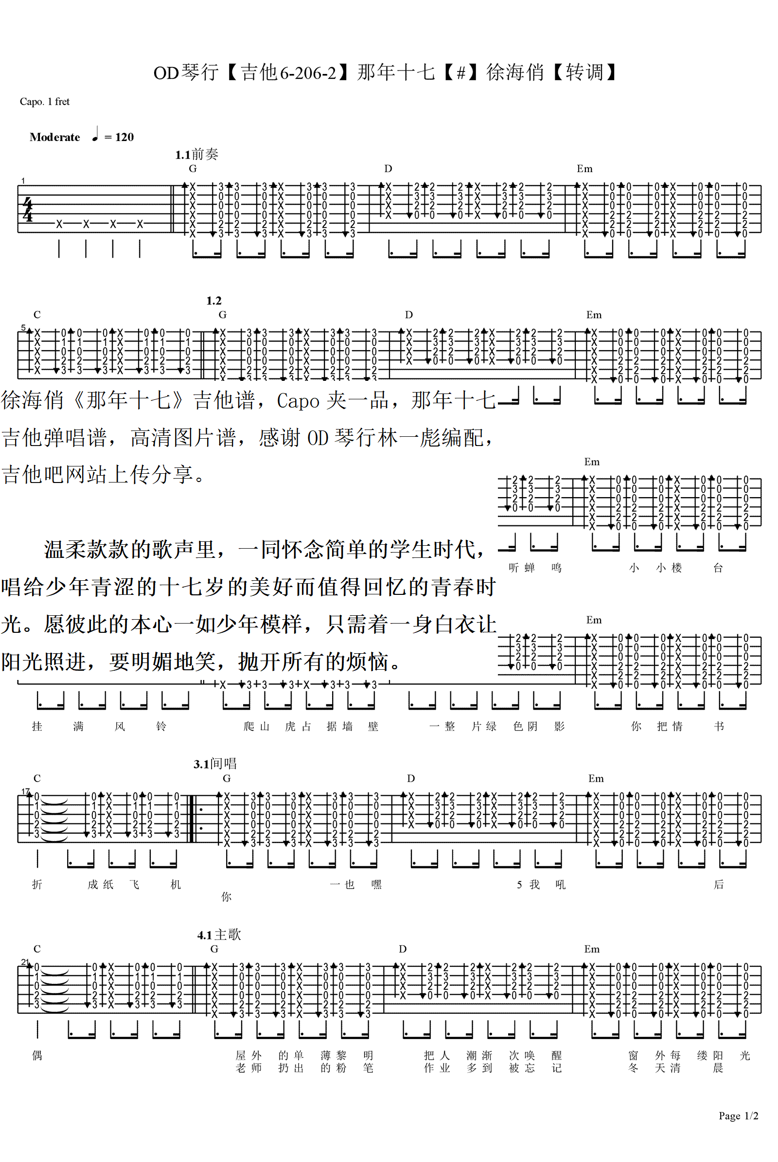 《徐海俏《那年十七吉他谱》》内容来自于互联网,不能保证内容的准确性与完整性,仅供学习交流欣赏,请勿用于其它用途,内容版权归原作者及来源网站所有,如有侵犯到您的权益请来信告知,我们将及时删除。