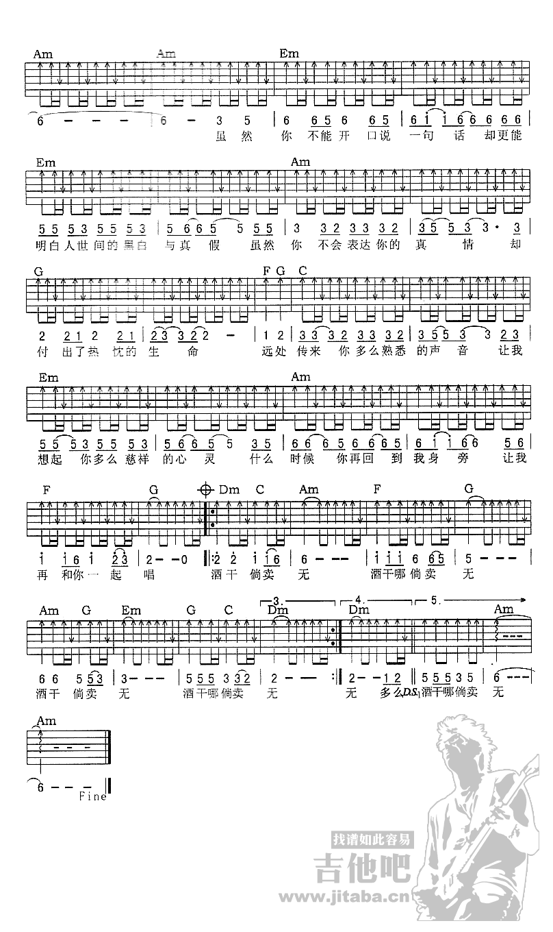 《苏芮《酒干倘卖无吉他谱》(C调)》内容来自于互联网,不能保证内容的准确性与完整性,仅供学习交流欣赏,请勿用于其它用途,内容版权归原作者及来源网站所有,如有侵犯到您的权益请来信告知,我们将及时删除。