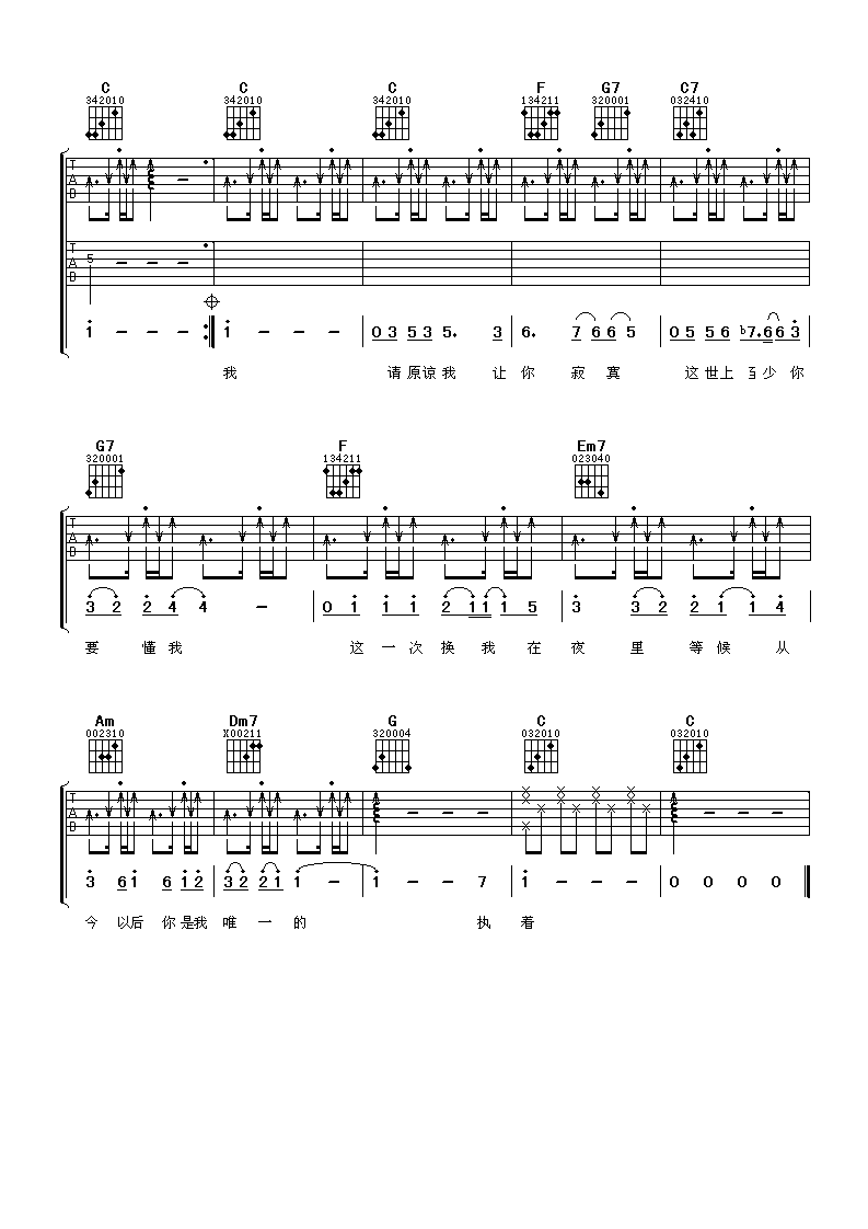 《言承旭《你是我唯一的执着吉他谱》(C调)》内容来自于互联网,不能保证内容的准确性与完整性,仅供学习交流欣赏,请勿用于其它用途,内容版权归原作者及来源网站所有,如有侵犯到您的权益请来信告知,我们将及时删除。