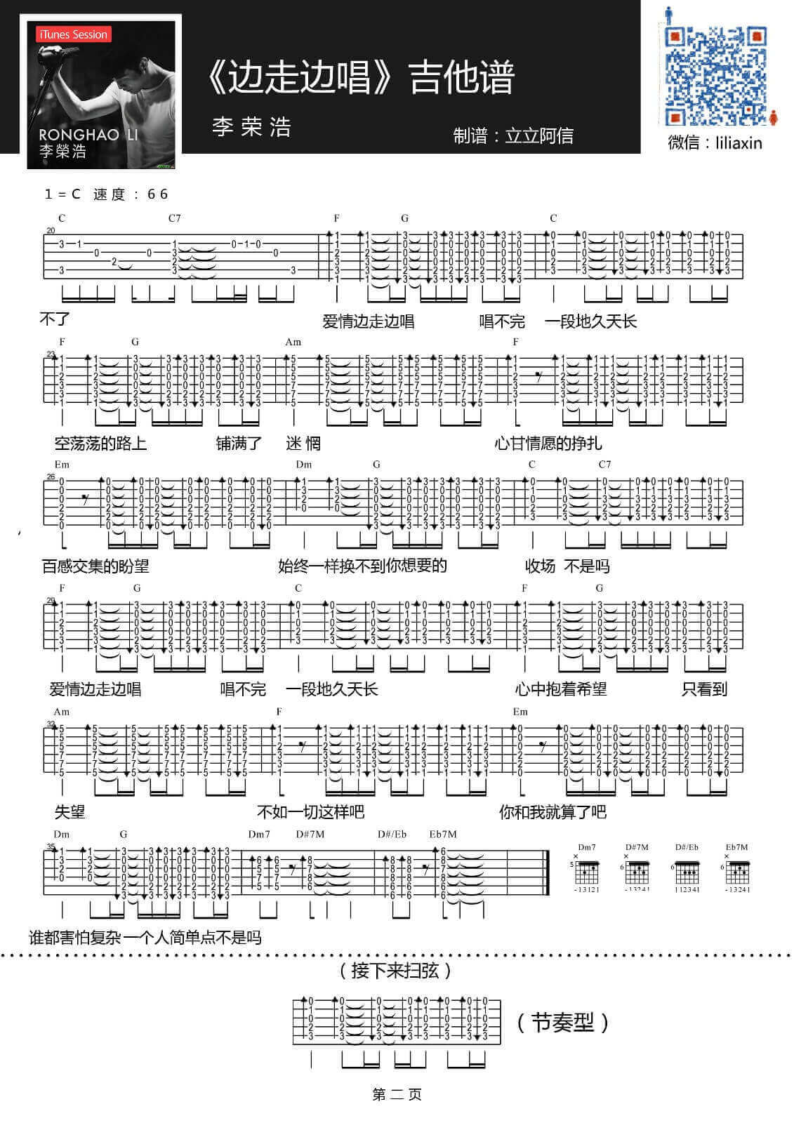 《李荣浩《边走边唱吉他谱》(C调)》内容来自于互联网,不能保证内容的准确性与完整性,仅供学习交流欣赏,请勿用于其它用途,内容版权归原作者及来源网站所有,如有侵犯到您的权益请来信告知,我们将及时删除。