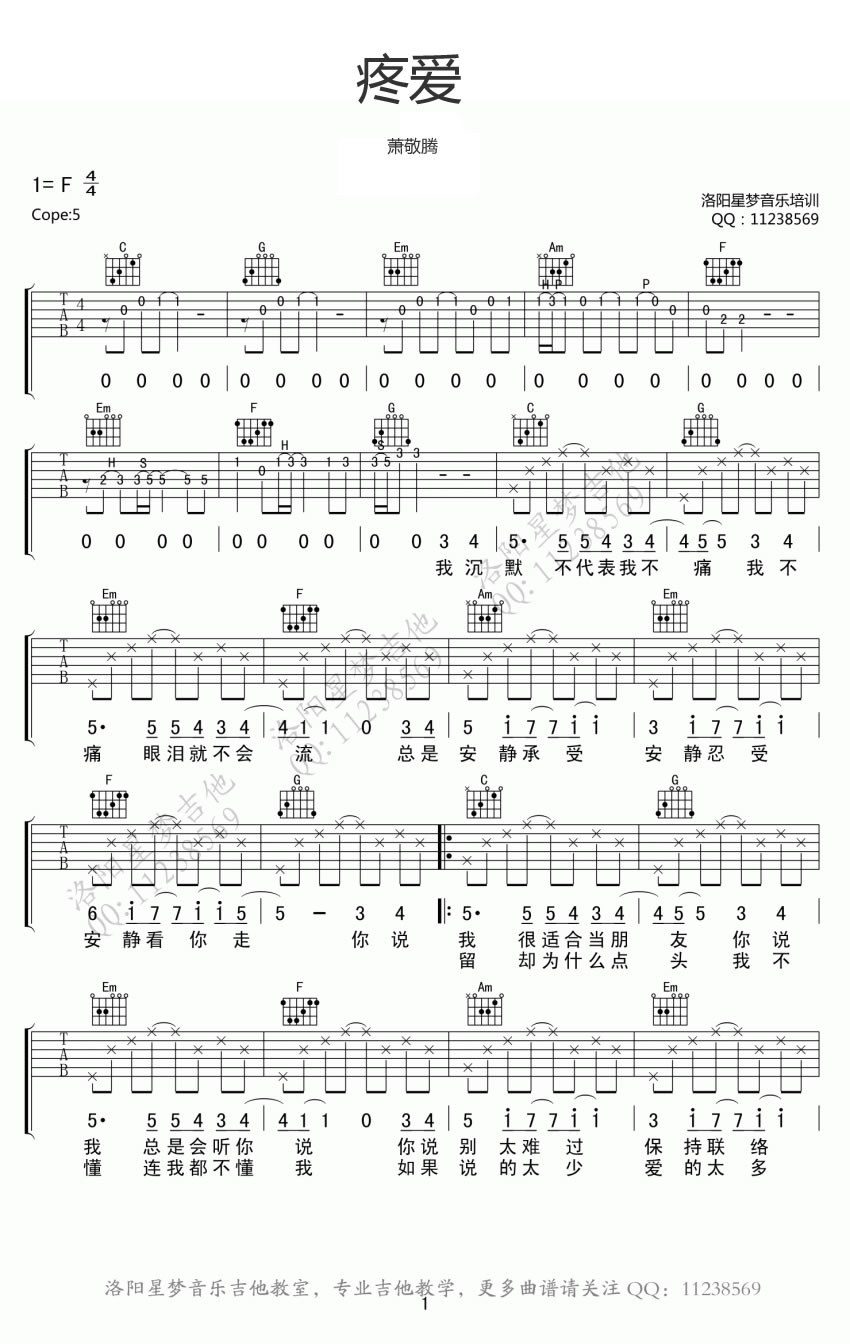 萧敬腾的吉他曲《疼爱》,以F调为基调,Capo夹在五品。感谢洛阳星梦音乐培训提供的六线谱编排图片。这首由五月天阿信为雨神萧敬腾创作的歌曲,旋律简单轻快,让人感到舒适轻松,然而却唱尽了离别的悲伤。