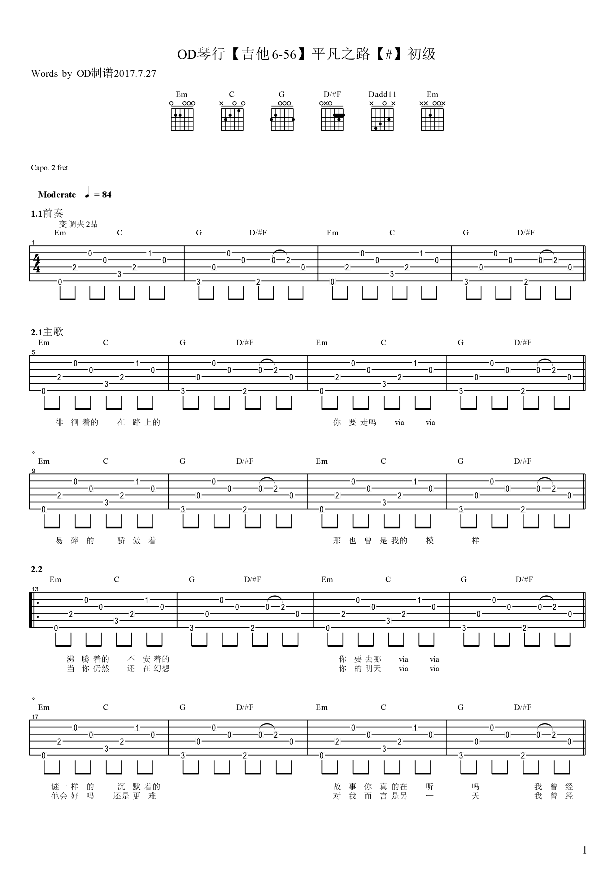 《平凡之路》是朴树演唱的一首深情歌曲,被选为电影《后会无期》主题曲。这首歌的吉他谱采用CAPO夹二品,提供了高清的图片谱。谱中以六线谱为基础,适合初学者,简单易弹。特别感谢OD琴行的编配,为乐手们提供了学习和演奏的便利。歌曲以平凡而真挚的旋律,勾勒出生活中的坎