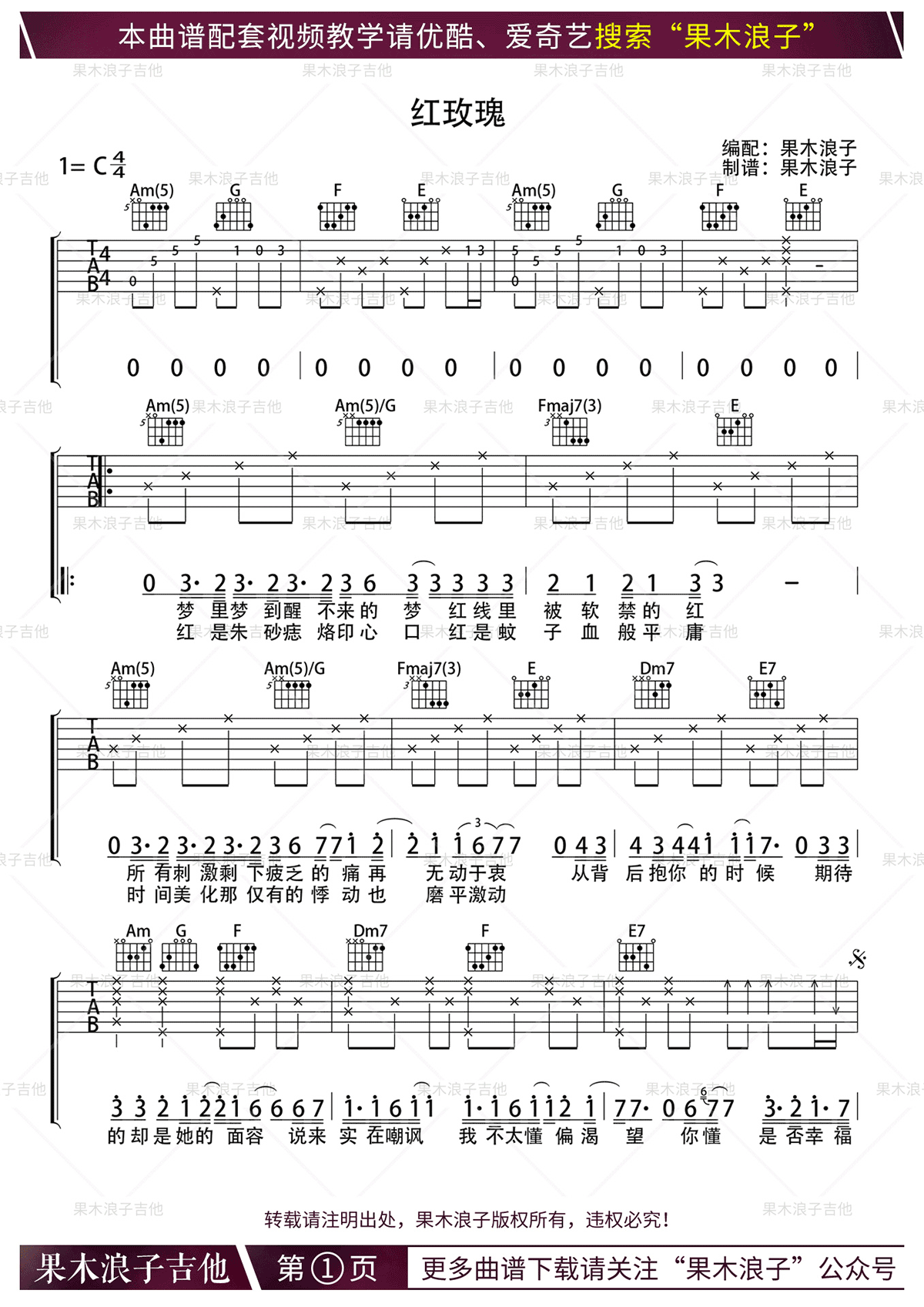陈奕迅的《红玫瑰》吉他曲谱,以原调C呈现,由果木浪子精心编配制谱。男生演奏时无需变调夹,而女生则可使用变调夹夹五品。感谢果木浪子的无私分享,看谱啦一如既往地对他表示感激。这首歌曲通过吉他和六线谱传达出深情款款的旋律,令人心生共鸣。陈奕迅以独特的嗓音演绎,《红玫